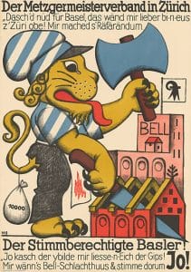 1926 ging es in Basel-Stadt buchstäblich um die Wurst: Gegen das geplante Bell-Schlachthaus an der Elsässerstrasse kam es zur Referendumsabstimmung. Pikant: Dem Zürcher Metzgerverband wurde vorgeworfen, er mische sich in den Abstimmungskampf ein. Also erschien ein monströser Zürileu mit blutiger Schürze und Schlachterbeil an den Basler Plakatsäulen.