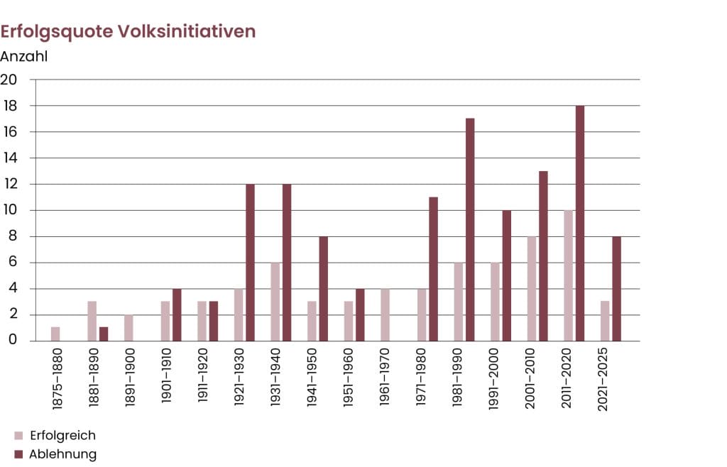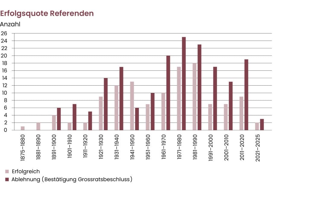 Unterschriftensammlungen und Abstimmungskämpfe bedeuten für ein Initiativ- oder Referendumskomitee viel Arbeit. Wie ist die Erfolgsbilanz der «Politik von unten»? In Basel-Stadt beträgt sie (1875-2025) bei den Volksinitiativen gut 36% und bei den fakultativen Referenden knapp 40%. Dabei gilt es mitzudenken, dass nicht wenige Volksinitiativen zurückgezogen werden, weil das Parlament einen akzeptablen Gegenvorschlag gemacht hat. Auch das sind Teilerfolge.