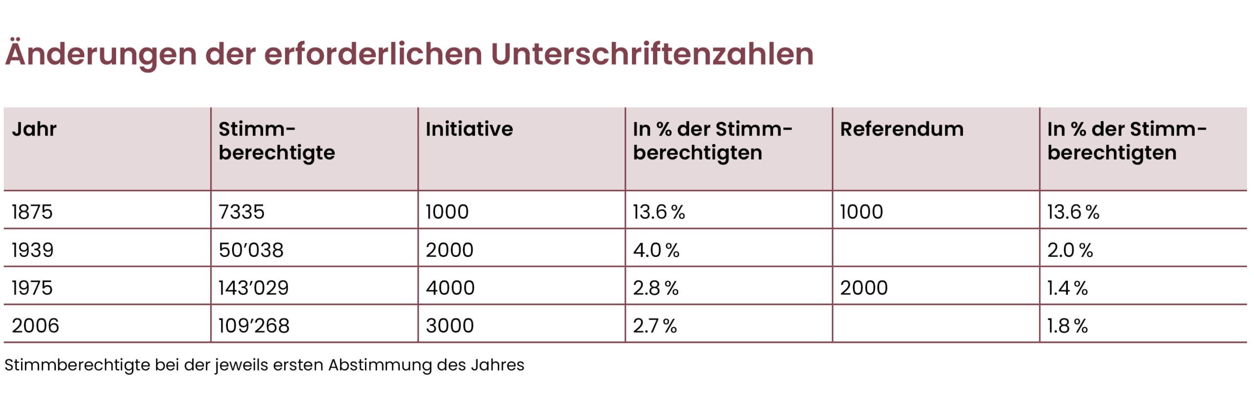 Bis Juni 1939 sind 1’000 Unterschriften erforderlich danach 2’000, ab 1975 4’000 und seit 2006 3’000 Unterschriften.