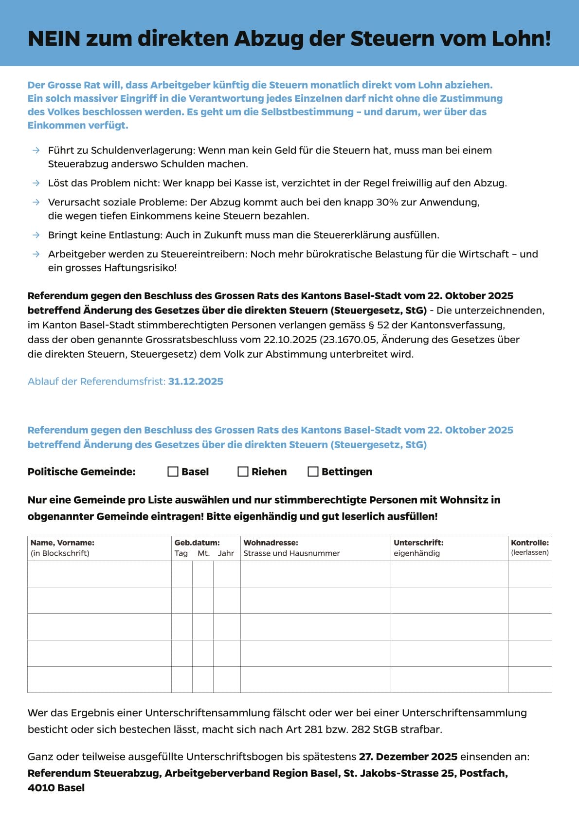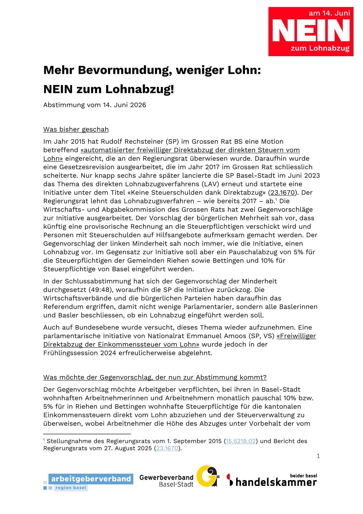 Bei der Änderung des Steuergesetzes handelt es sich um den Gegenvorschlag des Grossen Rates zur Volksinitiative «Keine Steuerschulden dank Direktabzug»; sie wurde aufgrund des Gegenvorschlags zurückgezogen. Gegen den Gegenvorschlag ist – was selten vorkommt – das Referendum ergriffen worden. Die SP-Initiative forderte, dass die Arbeitgeber bei den Arbeitnehmenden einen Lohnabzug vornehmen und diesen an die Steuerverwaltung überweisen, um der hohen Überschuldung von Privatpersonen entgegenzuwirken. Der Regierungsrat empfahl die Initiative ohne Gegenvorschlag zur Ablehnung, weil er den Nutzen für zu gering hielt. Der Grosse Rat beschloss jedoch einen Gegenvorschlag, der auf einen vereinfachten Direktabzug setzt: Arbeitgeber sollen für Personen mit Wohnsitz in Basel einen Steuerabzug vom Lohn von 10% vornehmen, bei einem Wohnsitz in Riehen oder Bettingen beträgt er 5%. Für Unternehmen mit weniger als 50 Mitarbeitenden ist der Lohnabzug freiwillig und alle Arbeitnehmenden können aktiv auf den automatischen Direktabzug verzichten (Opt-Out). Die Gegnerschaft warnt vor einem teuren Bürokratieprojekt, welches das Ziel verfehle und die Eigenverantwortlichkeit untergrabe. Basel-Stadt wäre der erste Kanton mit einem direkten Steuerabzug.