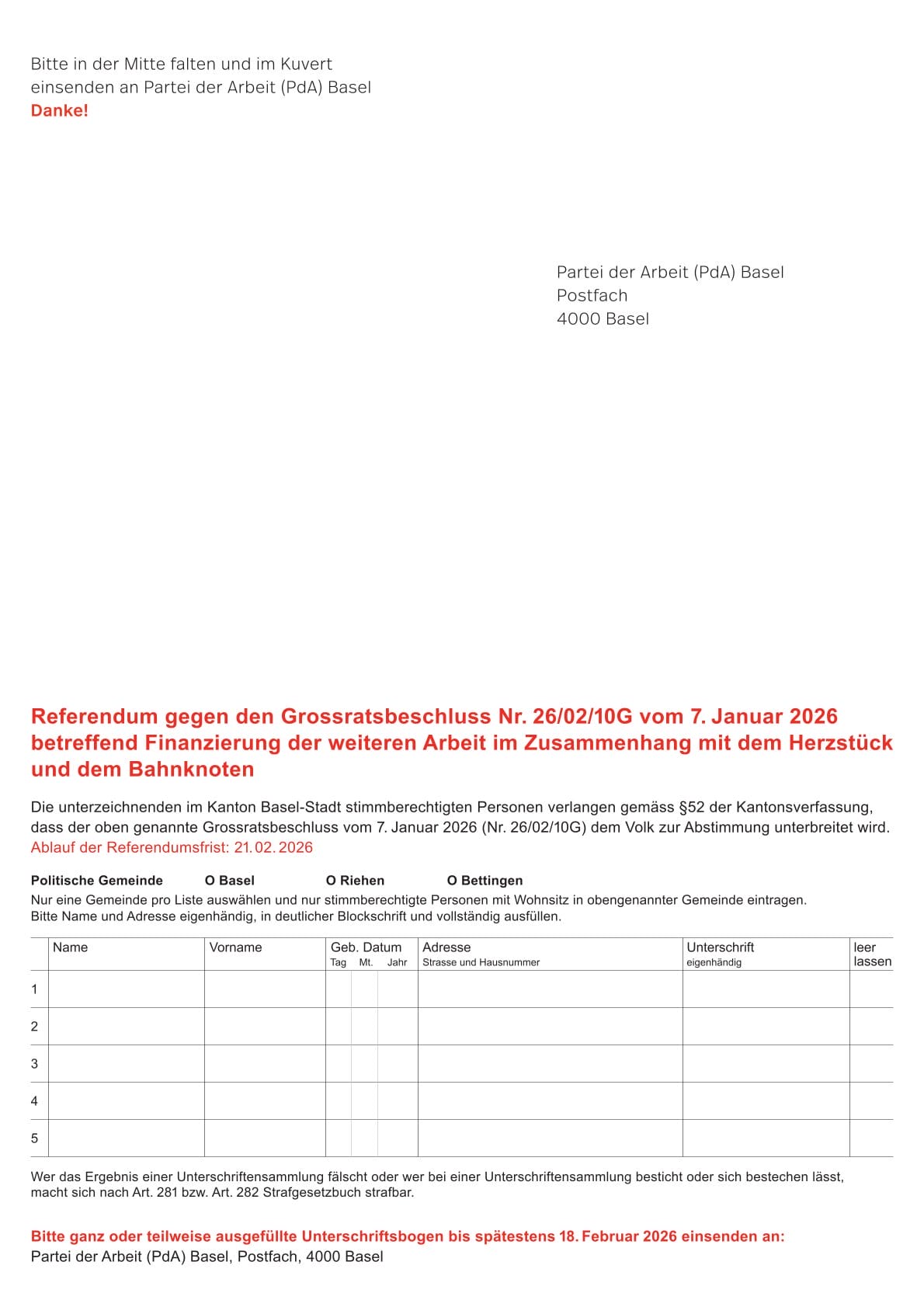 Der Grossratsbeschluss betrifft eine Ausgabe von weiteren 3,6 Millionen Franken für Planungen im Zusammenhang mit den Bahnausbauprojekten «Herzstück» und Bahnknoten Basel. Davon sind gut 2,7 Mio. Franken für die Umgestaltung des Stadtraums Basel SBB vorgesehen: Der Markthallenplatz soll zu einem ÖV-Umsteigeknoten werden und damit den Centralbahnplatz entlasten. Die Markthallenbrücke soll abgerissen werden, um eine Tram-Direktverbindung zwischen Markthallenplatz und Elisabethenstrasse sowie einen Park zu ermöglichen. Die weiteren 850’000 Franken sollen ins Lobbying für das Herzstück und den Bahnknoten Basel fliessen – kurz vor dem Grossratsentscheid hatten die Regierungen BS/BL das Herzstück aufgrund schlechter Chancen beim Bund allerdings zu einer Durchmesserlinie redimensioniert. Das Referendumskomitee hält eine unterirdische Bahnverbindung zwischen Bahnhof SBB und Badischem Bahnhof für ein «Wahnsinnsprojekt», das viele Milliarden kosten, nur wenig Nutzen bringen würde und mit einer jahrelangen Bauzeit verbunden wäre.