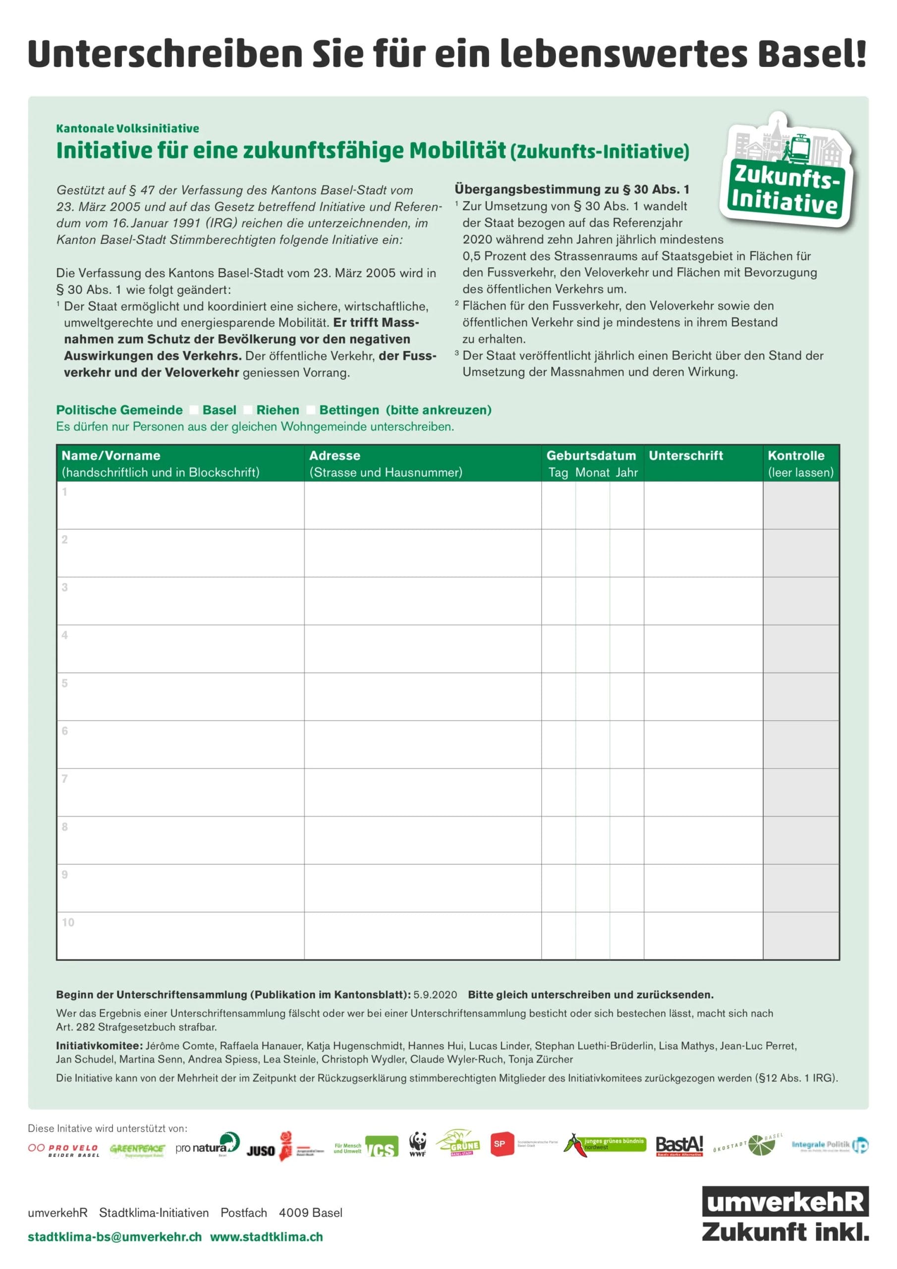 | Beschreibung der Vorlage | Die Zukunfts-Initiative war eine der beiden Stadtklima-Initiativen, die gleichentags zur Abstimmung gelangten. Sie forderte einen klimafreundlichen Verkehr, in dem neben dem Öffentlichen Verkehr auch der Fuss- und Veloverkehr Vorrang vor dem Autoverkehr hat. Dazu sollten innert zehn Jahren mindestens 5 % der Strassenfläche im Kanton in Flächen für den Fuss- und Veloverkehr sowie zur Bevorzugung des Öffentlichen Verkehrs umgewandelt werden. Die Gegnerschaft warnte, dass Basel während Jahren zur Grossbaustelle würde und mit den Initiativen die wirtschaftliche Prosperität aufs Spiel gesetzt werde. |