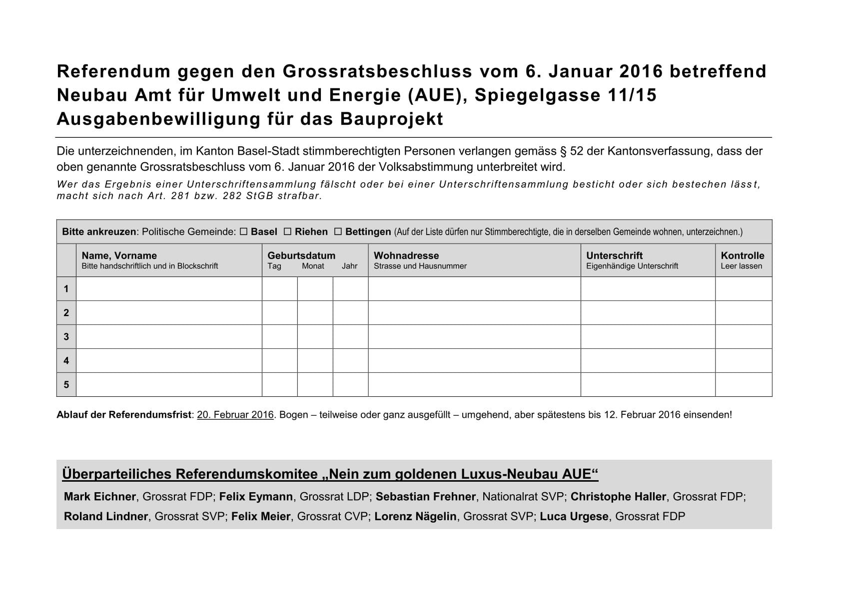 | Beschreibung der Vorlage | Der Grossratsbeschluss betraf eine Ausgabe von 16 Millionen Franken für einen Null-Energie-Neubau für das Amt für Umwelt und Energie (AUE) an der Spiegelgasse beim Fischmarkt. Der Neubau sollte ein Vorbild für klimafreundliches Bauen werden. Das Amt befand sich bisher in einem sanierungsbedürftigen Gebäude an der Hochbergerstrasse in Kleinhüningen. Die Gegnerschaft sprach von einem zu teuren «Luxus-Prestigeobjekt», das in der Innenstadt für Staatsangestellte entstehen solle. |