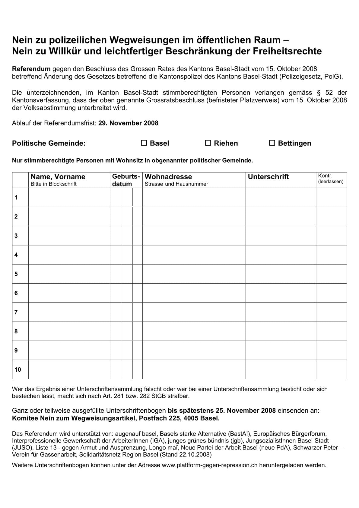 - Komitee Nein zum Wegweisungsartikel : Unterschriftenbogen : Kant. Abstimmung vom 8.2.2009 zur Änderung des Polizeigesetzes betr. befristeter Platzverweis : Datenbank Baselvotes