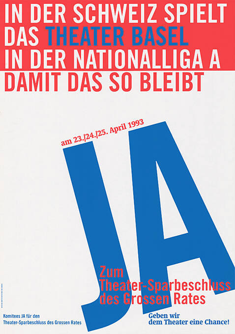 | Beschreibung der Vorlage | Der Grossratsbeschluss betraf eine dreijährige Subvention an das Theater Basel von 35,2 Millionen Franken in der Spielzeit 1993/94, von 34,7 Millionen für 1994/95 und 34,2 Millionen für 1995/96. Dem Theater sollte damit genügend Zeit für ein Sparkonzept eingeräumt werden. Der Regierungsrat hatte angesichts der hohen Staatsverschuldung nur eine zweijährige Subvention beantragt. Die Gegnerschaft forderte neben einer Sparpolitik auch höhere Beiträge vom Kanton Basel-Landschaft. |