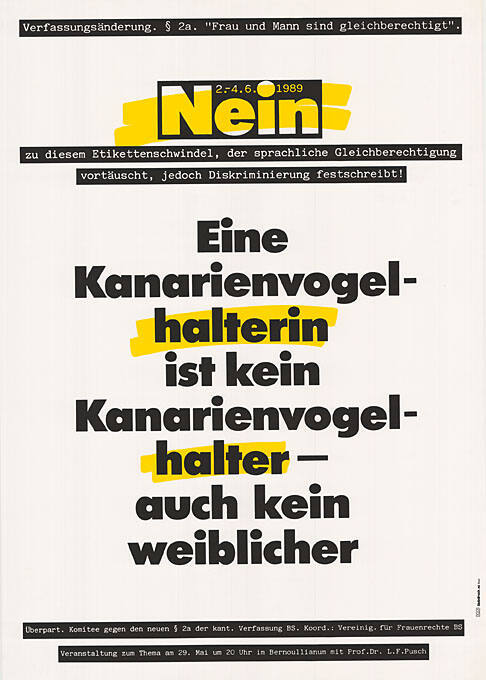 | Beschreibung der Vorlage | Der neue Verfassungsartikel verankerte die sprachliche Gleichberechtigung. Er übernahm den Artikel der Bundesverfassung «Frau und Mann sind gleichberechtigt» und hielt fest, dass alle Rechtssätze für beide Geschlechter gelten, auch wenn nicht beide Geschlechter genannt sind. Die Gleichberechtigungsklausel ermöglichte, dass Gesetze, Verordnungen etc. nicht sofort angepasst werden mussten. Gegnerische Stimmen wollten das Mitgemeint-Sein von Frauen nicht länger akzeptieren, die Unrechtsposition der Frauen werde so fortgeschrieben. |