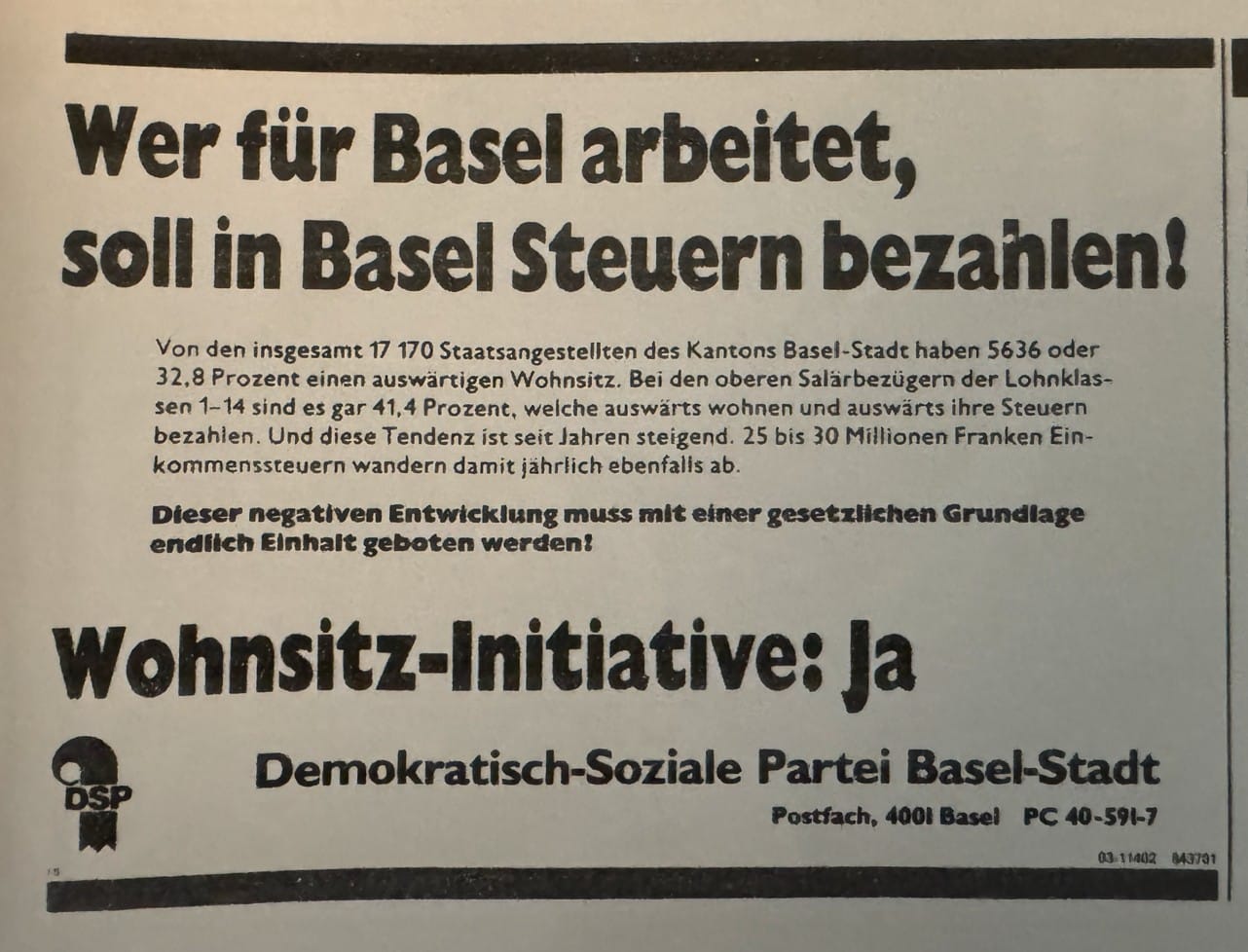 | Beschreibung der Vorlage | Die Volksinitiative verlangte die Wiedereinführung der Wohnsitzpflicht in Basel-Stadt für höhere Beamte und Angestellte. Die Wohnsitzpflicht war 1968 aufgehoben worden. Die Initianten fanden, dass eine hohe Anzahl auswärts wohnender Mitarbeitender zu einer Entfremdung vom staatlichen Arbeitgeber sowie zu mehr Pendlerverkehr führe. Zudem würden der Steuerkasse hohe Einnahmen entgehen. Es war die erste Volksinitiative der DSP, die sich 1982 von der SP abgespaltet hatte. Die Gegnerschaft argumentierte, dass es in Basel-Stadt zu wenig Wohnungen gebe und ein Wohnsitzzwang zu einer Ungerechtigkeit für höhere Beamte führen würde, da Kadermitglieder der Privatindustrie weiterhin Wohnsitzfreiheit hätten. Die unformulierte Initiative liess offen, ob die rund tausend auswärts wohnenden höheren Staatsbediensteten nach Basel-Stadt ziehen müssten oder der Wohnsitzzwang nur für Neuanstellungen gelten soll. In den Medien sprachen sich die Initianten für letzteres aus. (S. auch die zwei Abstimmungen vom 27.9.1992, Wohnsitzpflicht für Beamte und Gegenvorschlag.) |