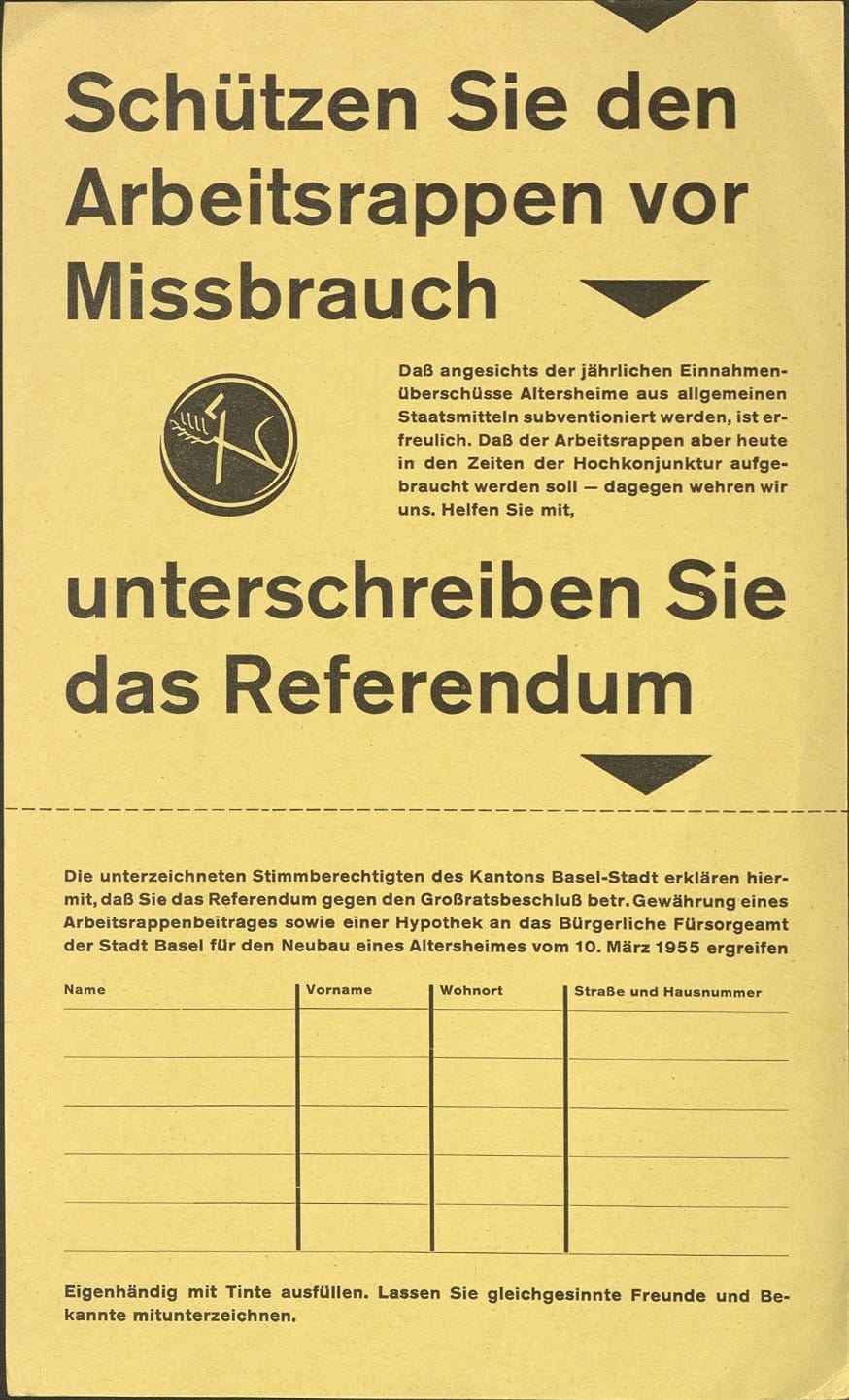 | Beschreibung der Vorlage | Der Grossratsbeschluss betraf einen Arbeitsrappenbeitrag von 423’500 Franken an das Fürsorgeamt der Bürgergemeinde Basel, damit dieses am Bruderholzweg ein neues Altersheim bauen konnte. Dazu kam eine Hypothek. Der Neubau sollte das veraltete, ebenfalls im Gundeldingerquartier beheimatete Bachofenschlössli ablösen. Der Streit drehte sich um die Frage, für welche Zwecke der 1936 eingeführte Arbeitsrappen verwendet werden darf. (S. Abstimmung vom 4.10.1936). Die Gegnerschaft fand, dass das Altersheim aus Staatsmitteln finanziert werden müsse. Für die Befürworter entsprach ein Altersheim hingegen genau dem beabsichtigten Zweck des Arbeitsrappens, zumal eine Gesetzesänderung 1948 dessen Verwendung über Arbeitsbeschaffung hinaus auch für soziale Aufgaben geöffnet hatte. |