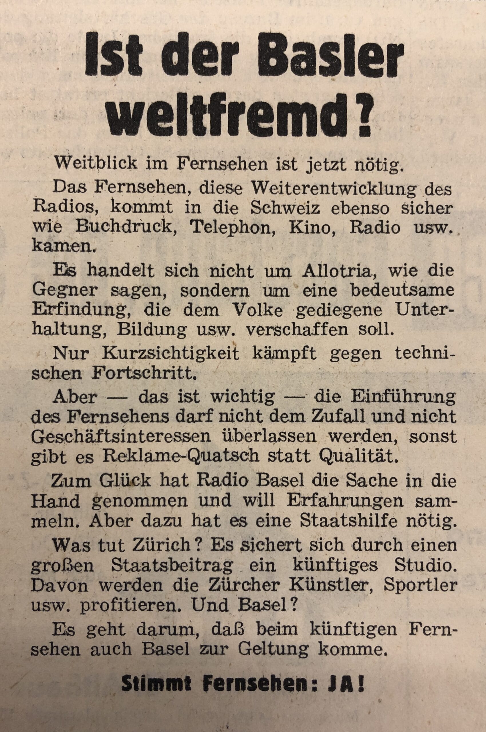 | Beschreibung der Vorlage | Der Grossratsbeschluss betraf einen Beitrag von 55’000 Franken des Kantons Basel-Stadt für einen Fernseh-Versuchsbetrieb der Radiogenossenschaft Basel. U.a. sollten die Empfangsverhältnisse Basels abgeklärt werden. Im Abstimmungskampf ging es ums Geld, aber auch um die Frage, ob der Staat für etwas bezahlen soll, das nur wenigen zugutekommt, auch wenn öffentliche Fernsehstuben vorgesehen waren. Es gab auch Ängste vor «amerikanischem Schund», der ein kultureller Rückschritt und ungesund für die Jugend sei. |